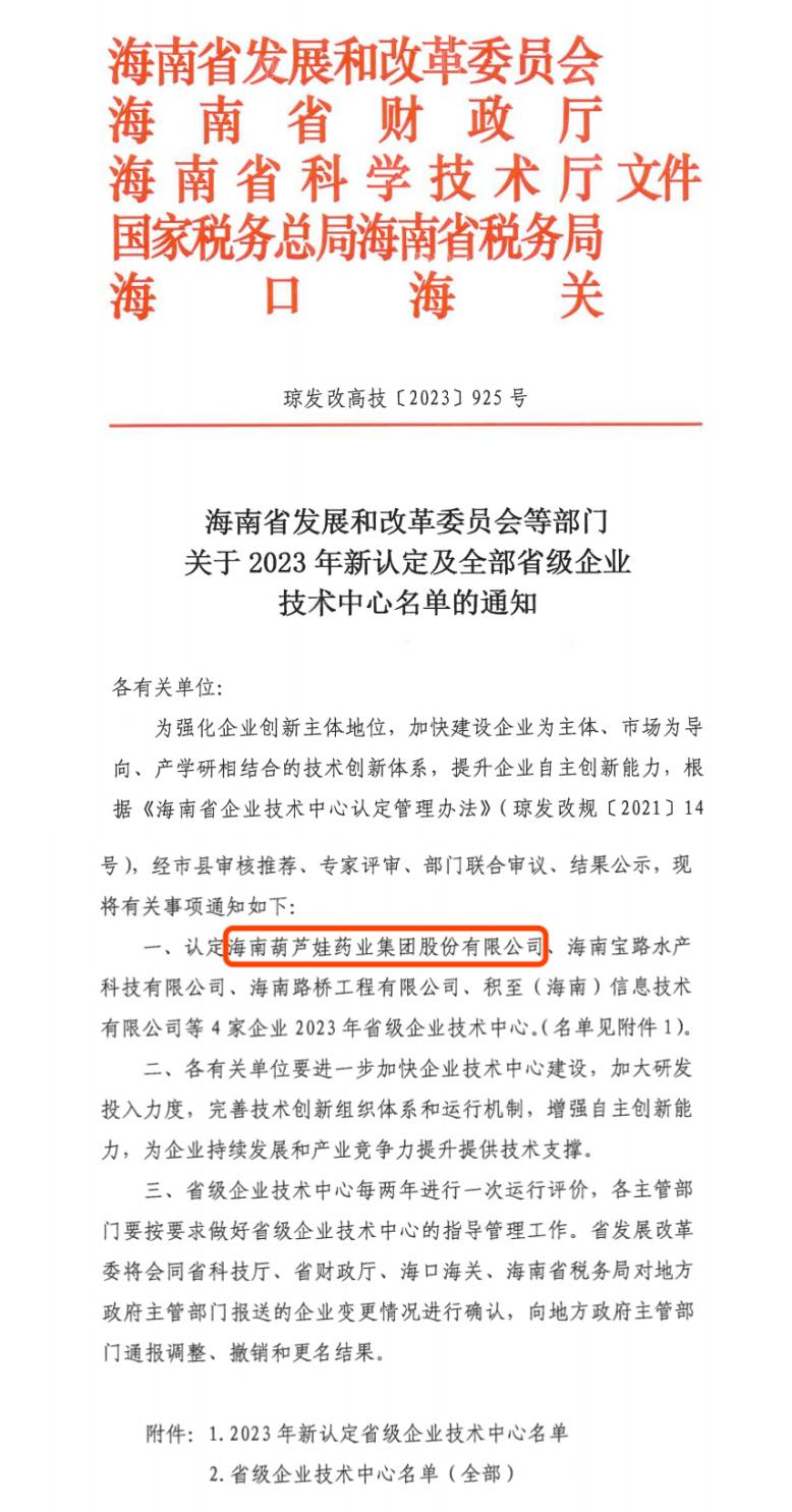 近日,海南省发改委等多部门联合公布了《关于2023年新认定及全部省级企业技术中心名单的通知》,其中,海南GA黄金甲药业集团股份有限公司成功通过评审,被认定为省级企业技术中心,是本次获批的4家企业之一。