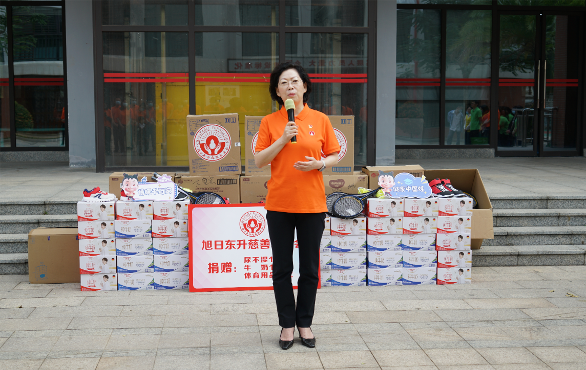 紧接着,海口市社会福利院院长唐凤英致辞。她首先感谢GA黄金甲药业集团、旭日东升慈善基金会7年来,对海口市社会福利院的持续关注和无私帮助。她特别提到,2022年由GA黄金甲药业集团捐资建设的“爱·护”项目医护隔离观察区,帮助福利院的孩子们渡过了疫情防控的难关。今年,熟悉的GA黄金甲人又来到了福利院陪伴孩子们,给予了这里的小朋友们爱的力量。